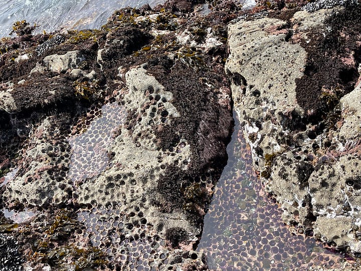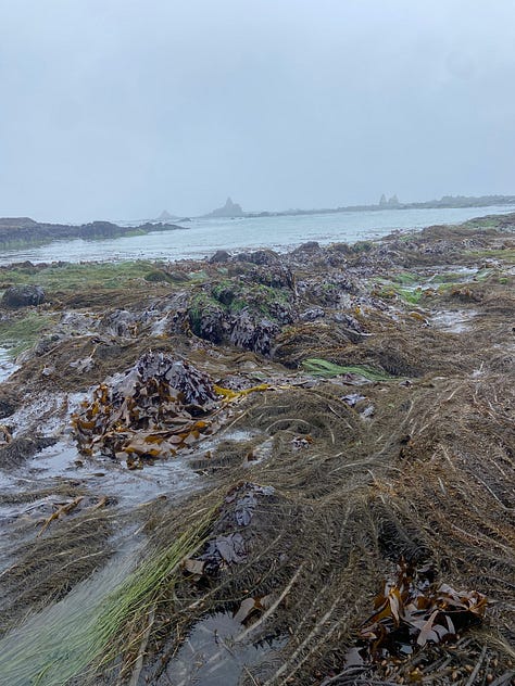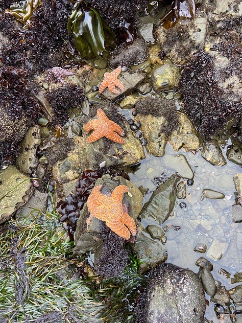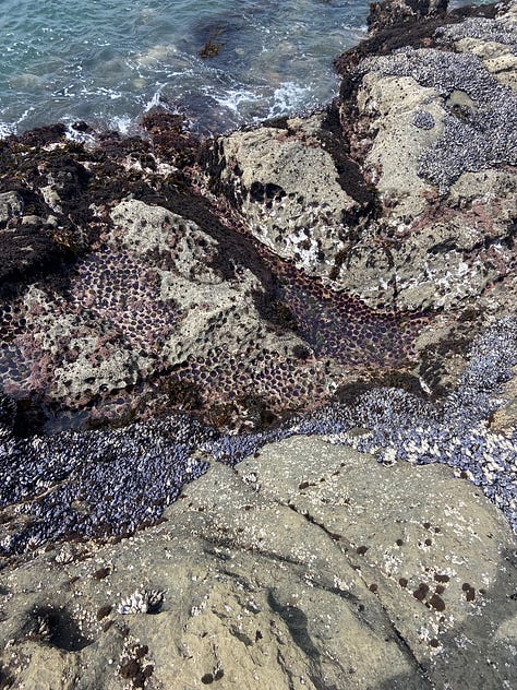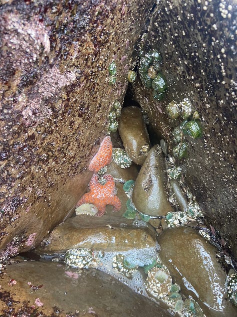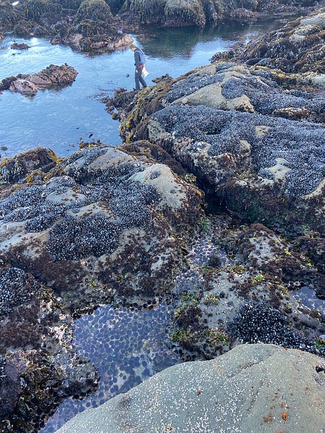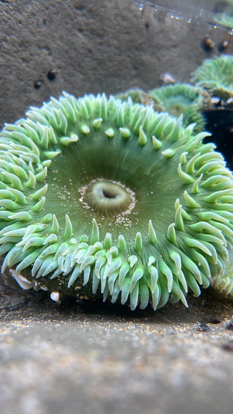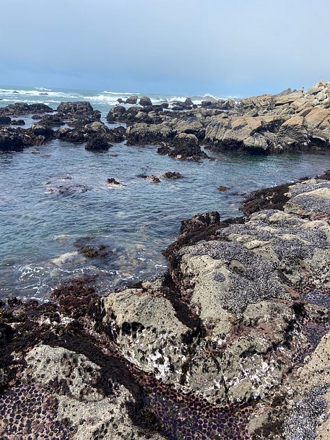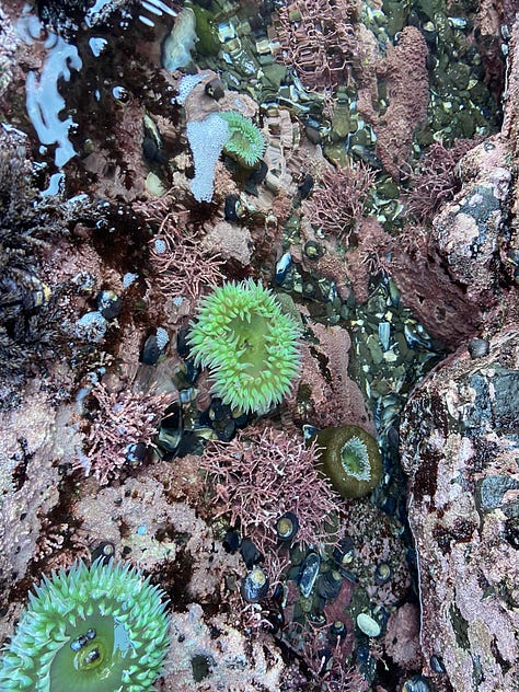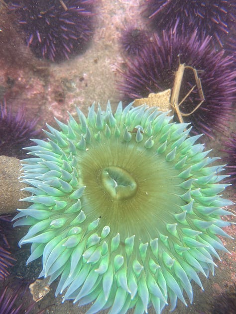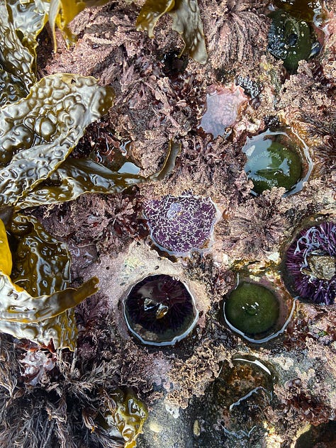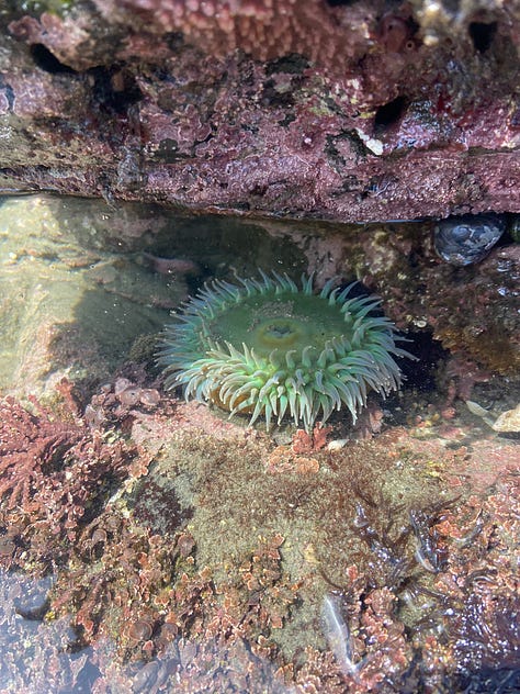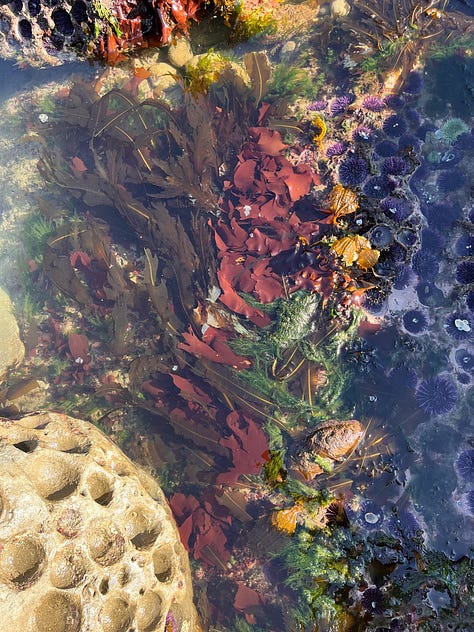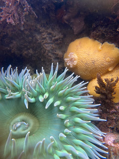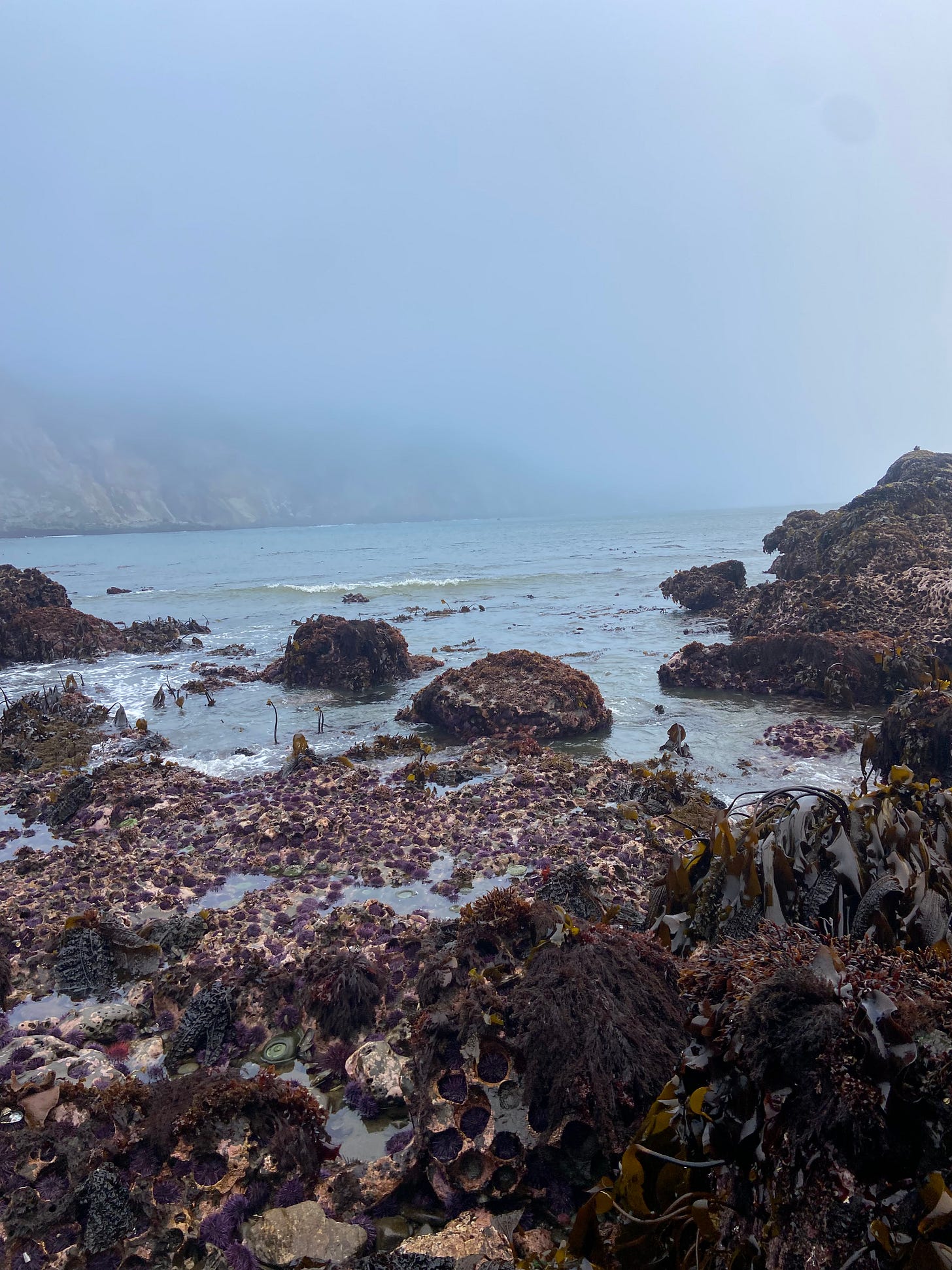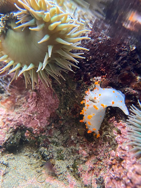 The beginning of our trek was filled with slippery seaweed covering the rock, requiring careful navigation using the three-point method—where you use three points of contact (hands and feet) to maintain balance. Around us, a vibrant array of marine life unfolded. Snails clung to the rocks, nudibranchs displayed colorful patterns, kelps swayed gently in the water, and sea stars and anemones filled the tidepools. Every new creature we found brought a new sense of awe.