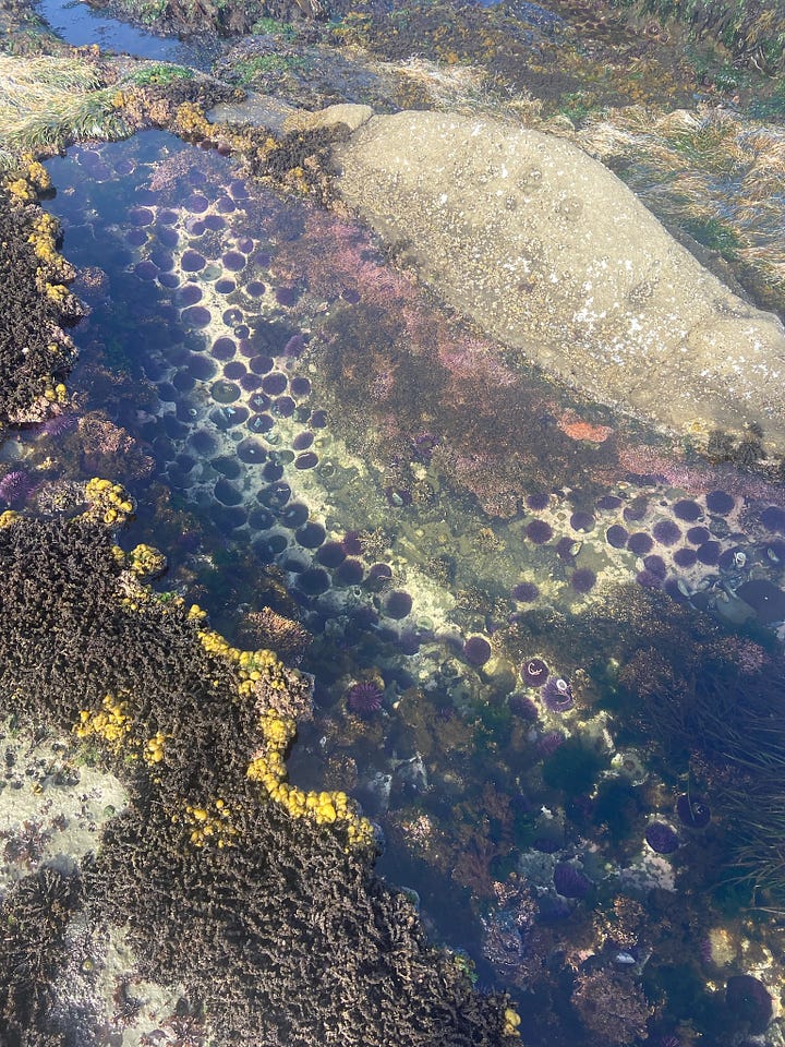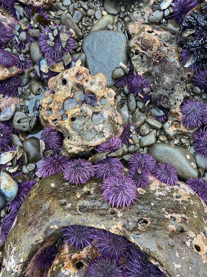 As we ventured further, purple began to dominate the scene. At first, it was subtle—a patch here, a speck there, but soon it was impossible to ignore. Purple sea urchins covered the rocks in overwhelming numbers, transforming the tidepools from a vast array of colors to a spiny purple expanse. At OIMB, we’d been taught that if you lose your balance, stepping on urchins isn’t just safe—it is also our way of helping to combat their overpopulation as these purple urchins have expanded far and wide across the Oregon Coast, devastating Oregon’s kelp forests, turning a thriving ecosystem into a barren wasteland.