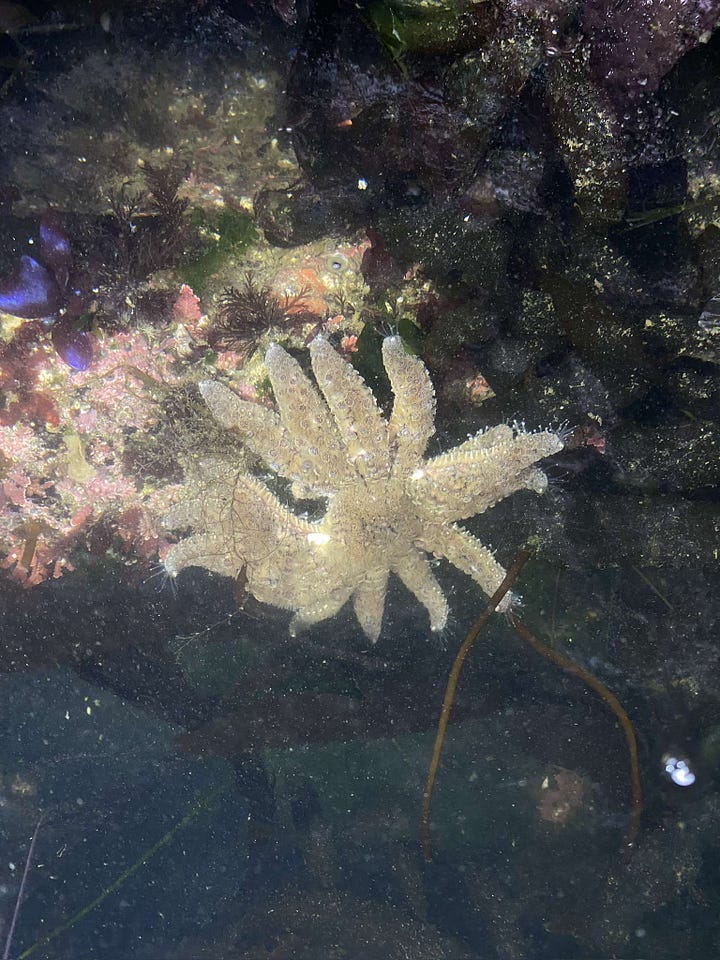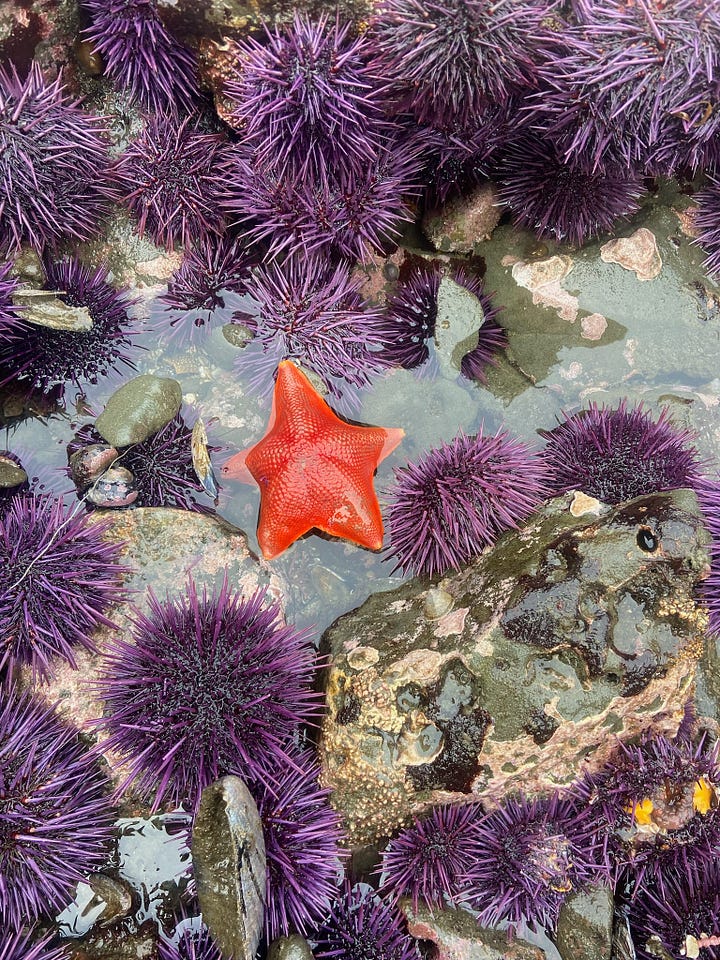 Standing at the edge of South Cove, surrounded by an overwhelming amount of purple spines, I couldn’t help but think about the vital work being done just a few miles down the road at OIMB by Dr. Aaron Galloway, a marine ecologist who focuses on kelp forest ecology and sunflower sea star recovery. Galloway’s work explores the intricate relationships within kelp forest ecosystems, focusing on potential solutions to counter the devastation caused by the overpopulation of purple sea urchins. One of his most promising areas of study involves the sunflower sea star, a predator whose recovery could hold the key to restoring balance to the kelp forests.